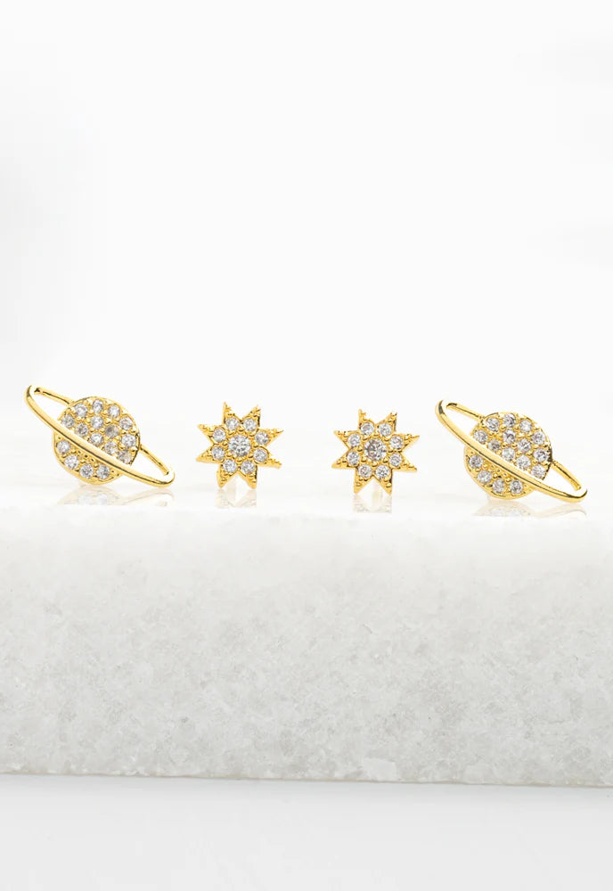 Our Celestial Orbit Studs combine timeless elegance with stellar charm. The 18K gold plated pair reflect the warmth of the Sun and the majestic rings of Saturn.